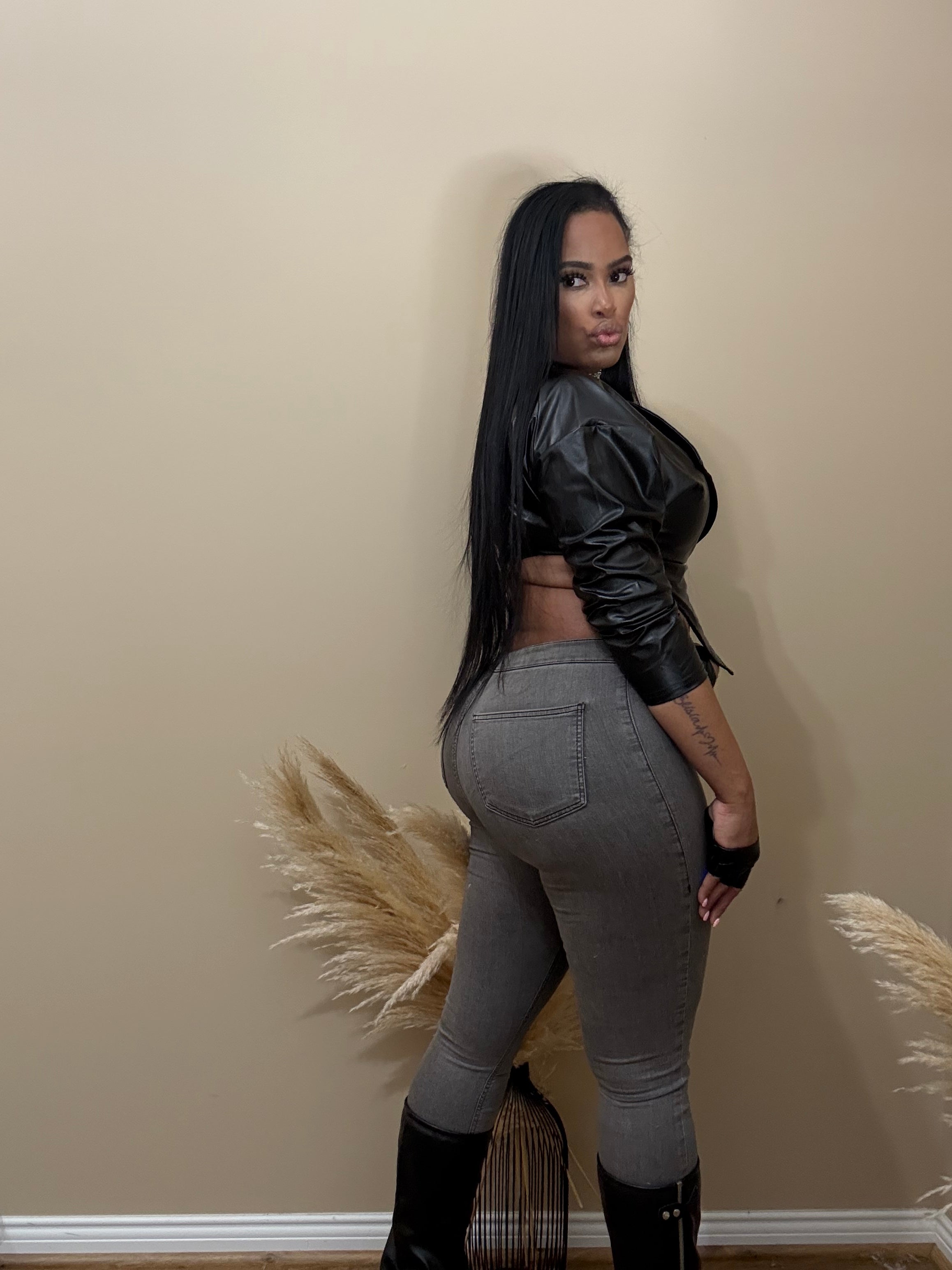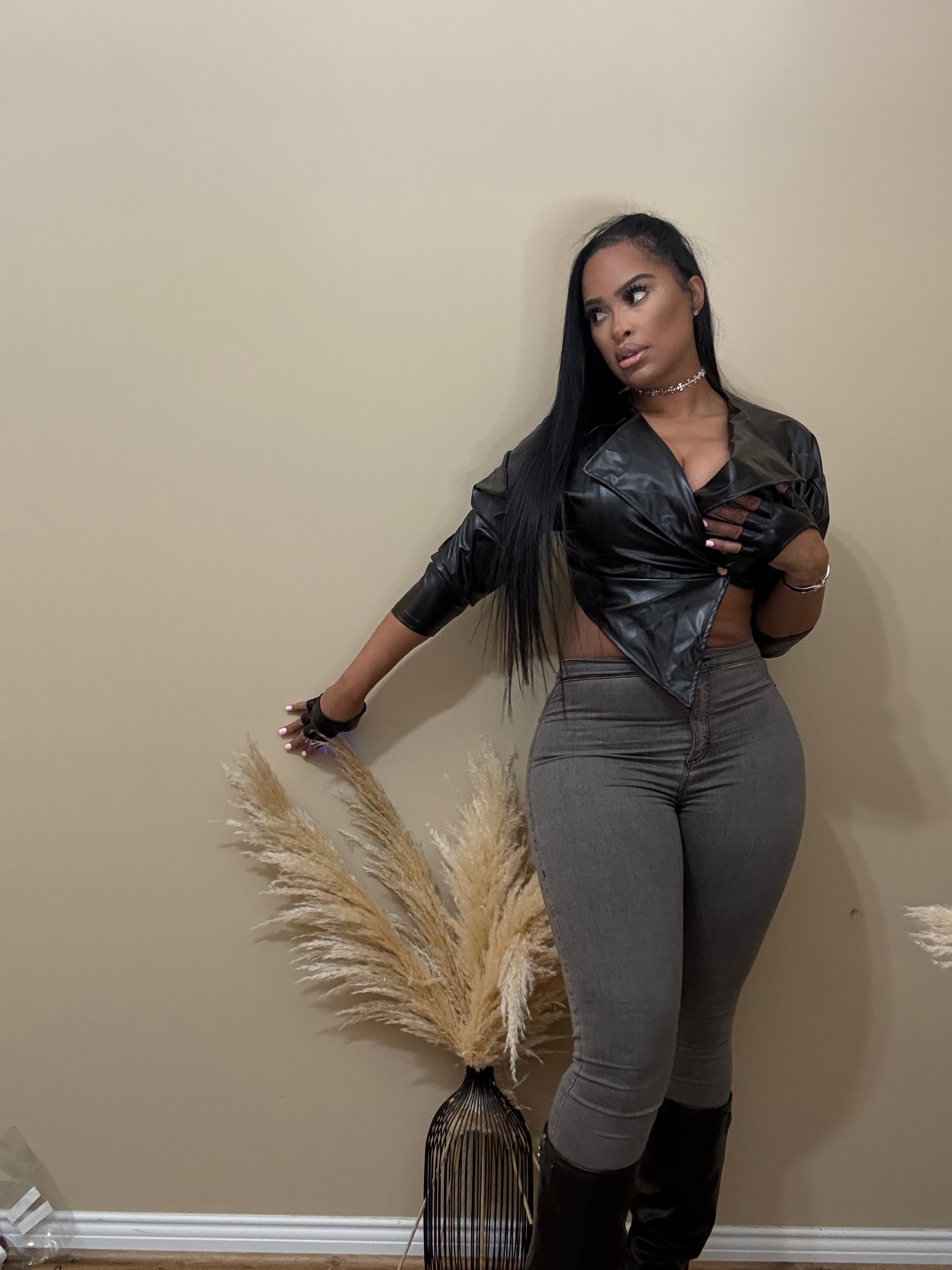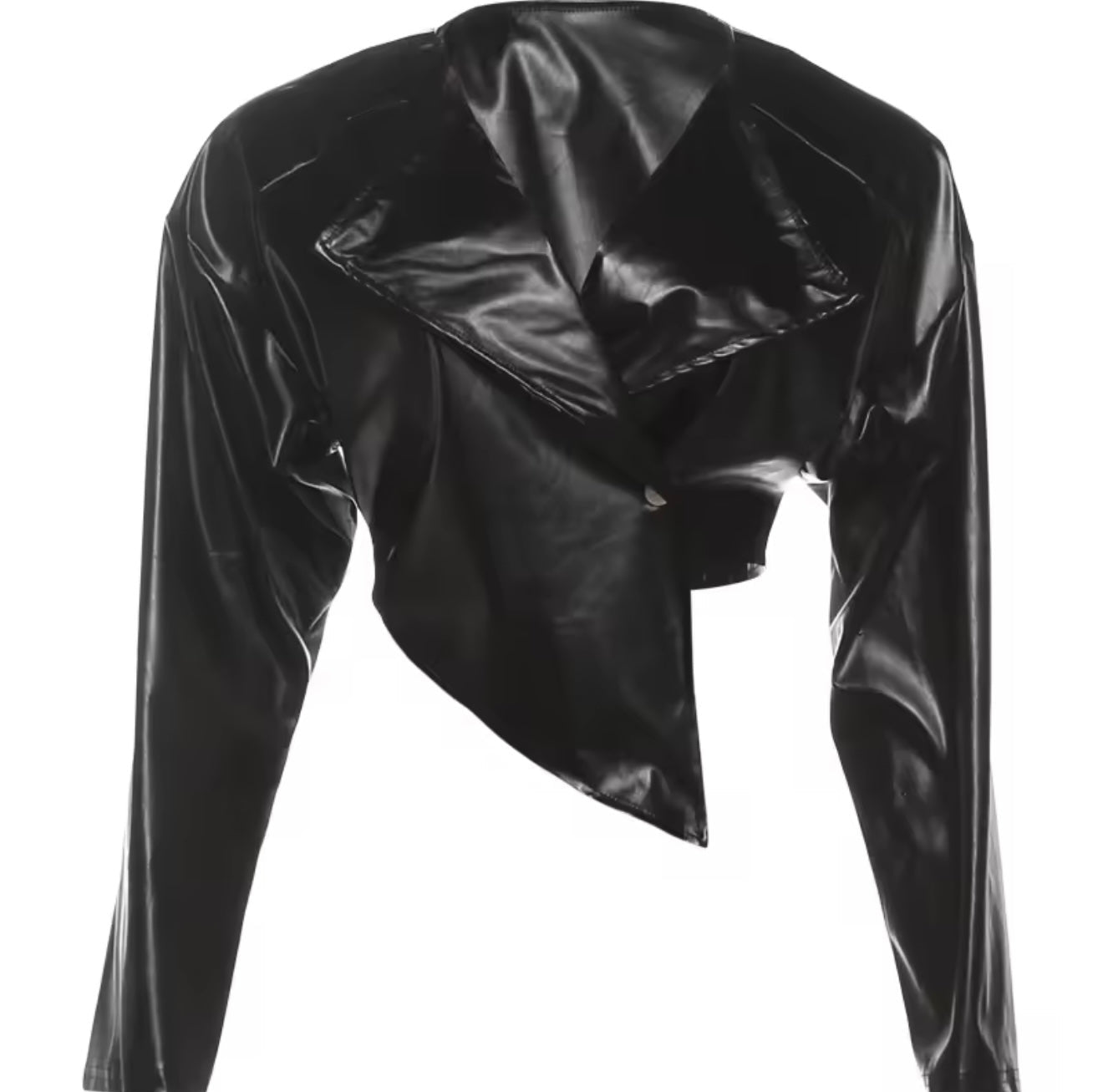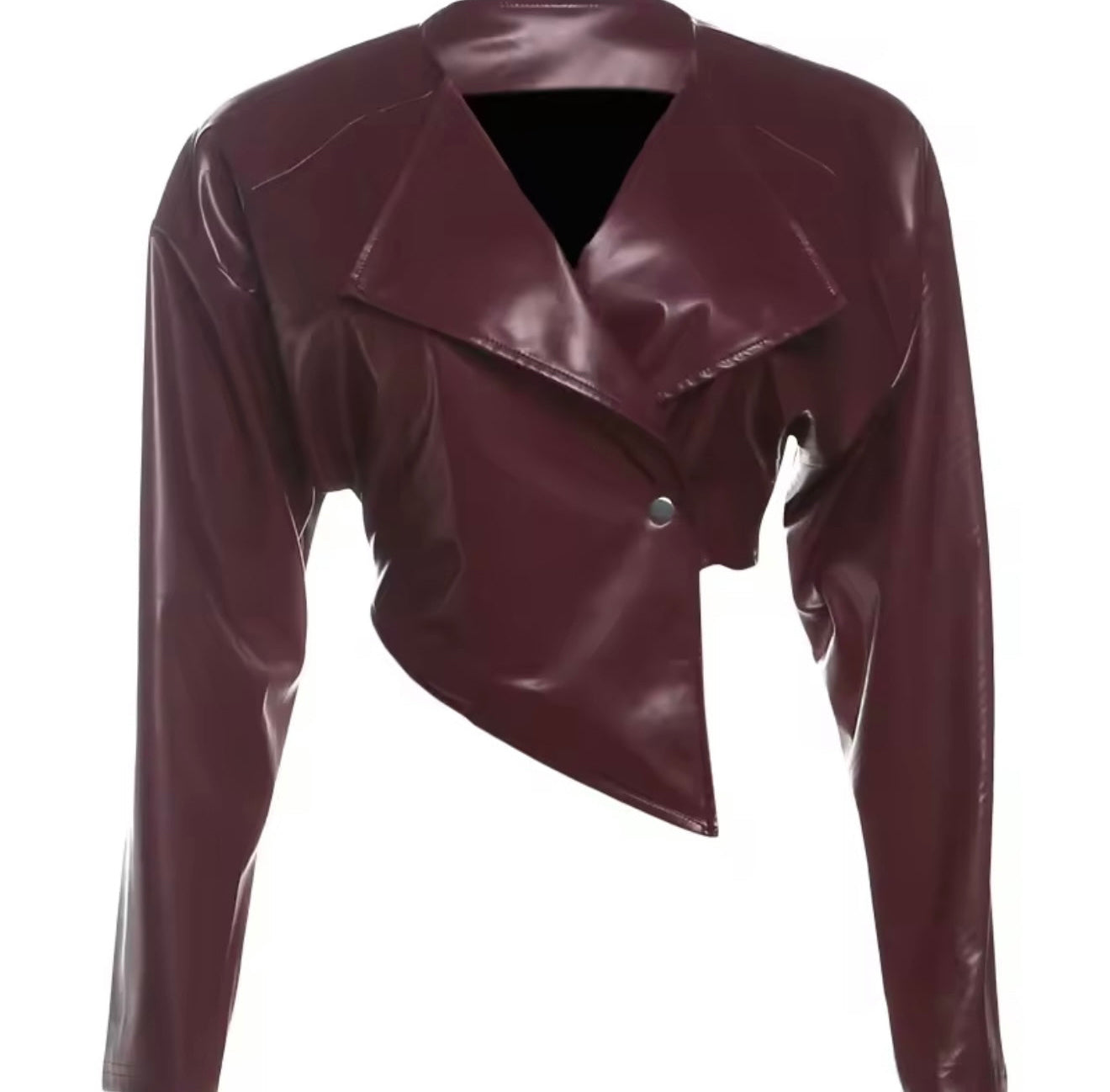 Faux Leather Asymmetrical Moto Jacket Oversized Collar Long Sleeves Front Button Closure Asymmetrical Hemline Cropped Fit...