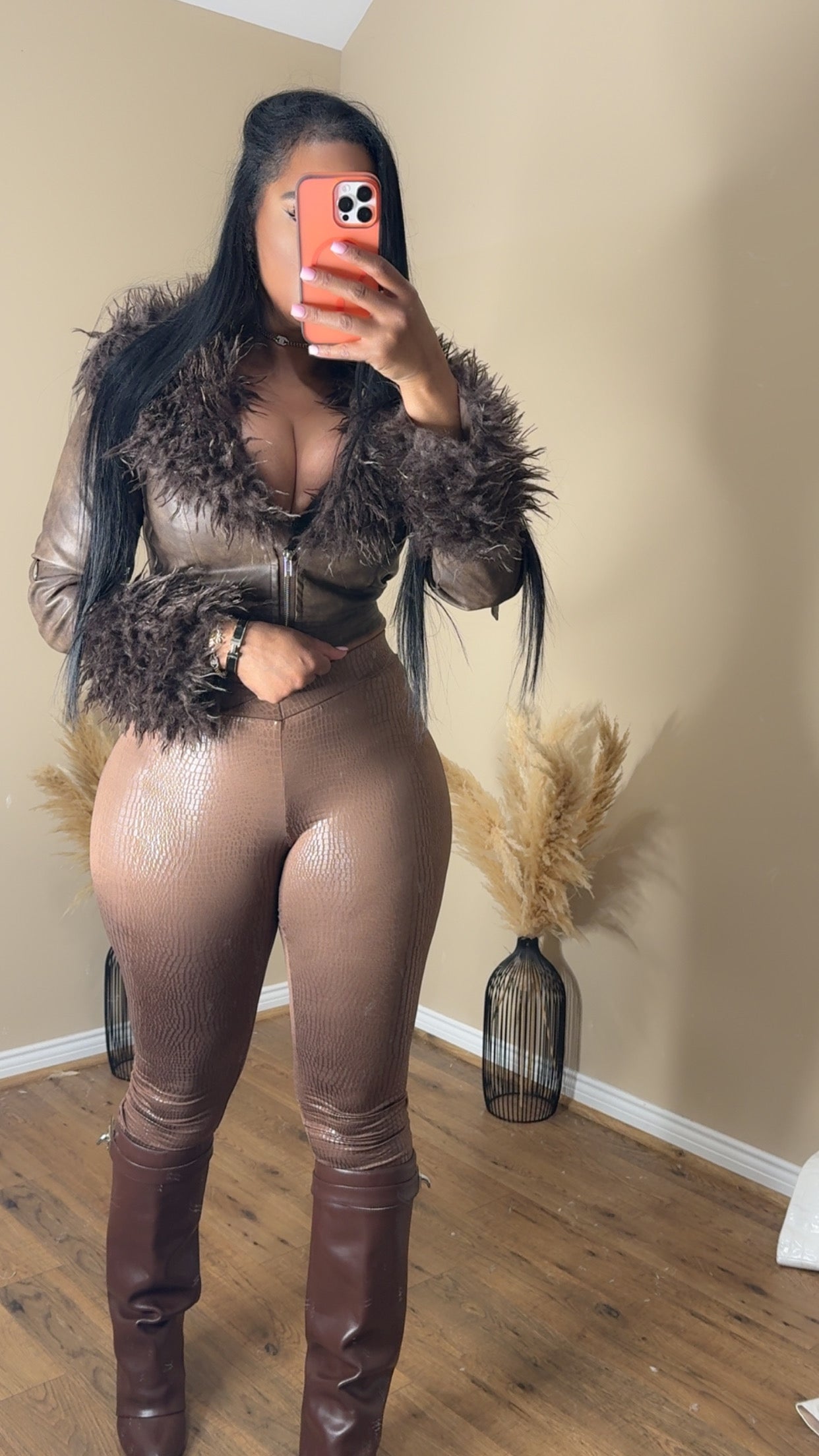 Faux leather plush fur cuffs and collar