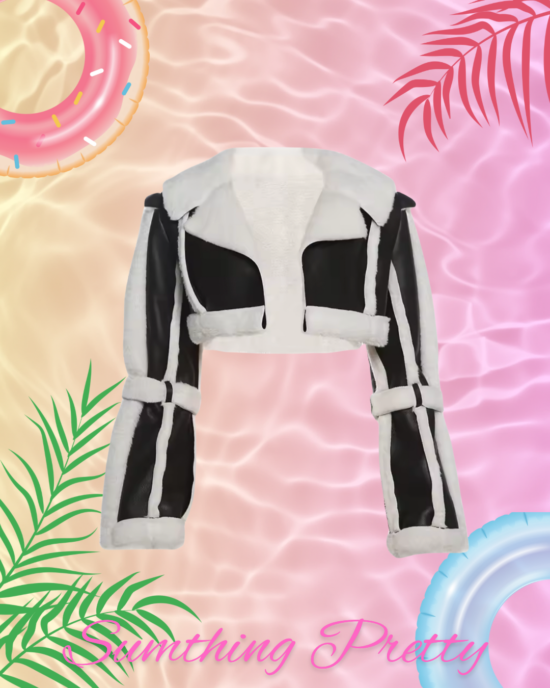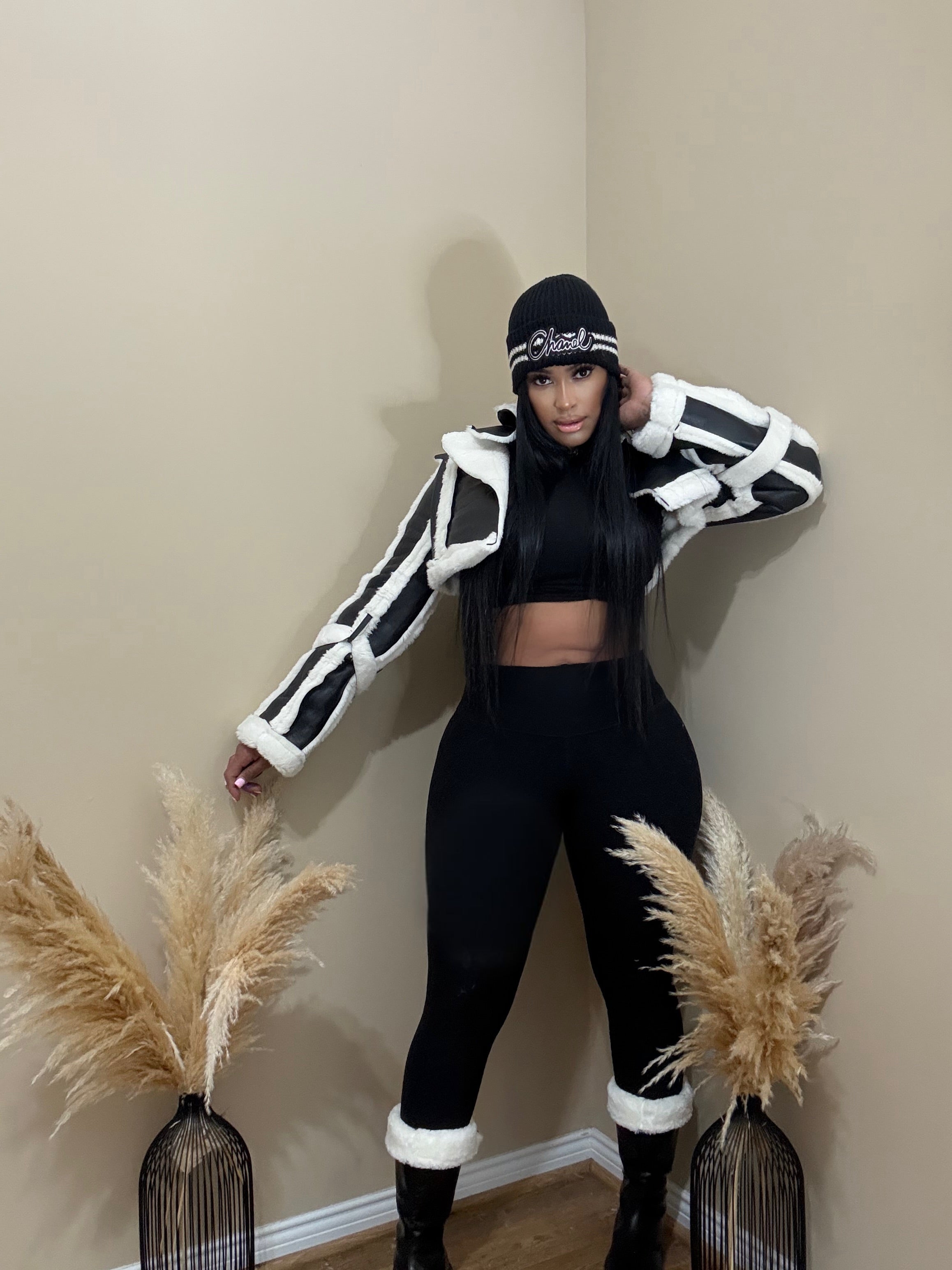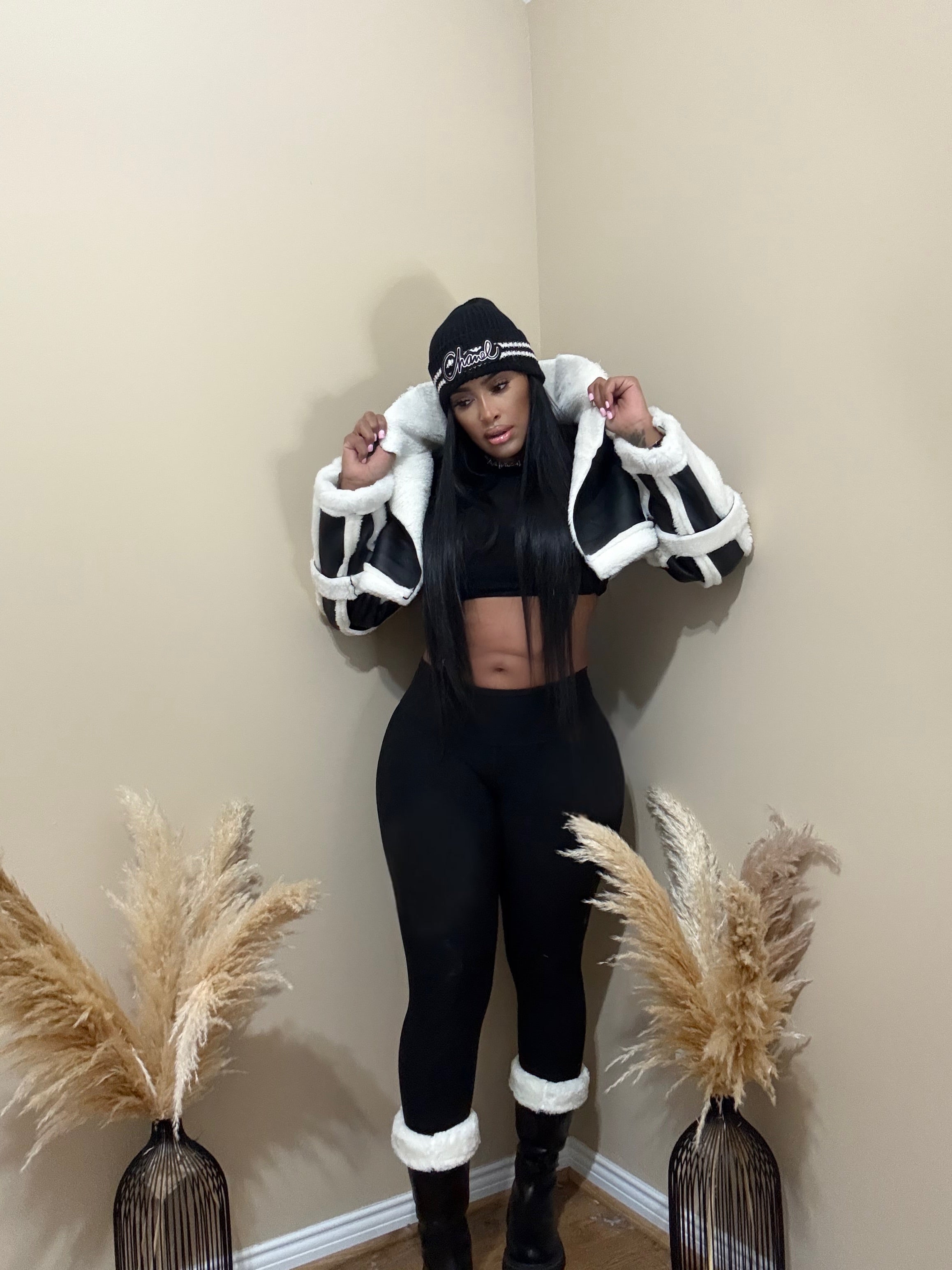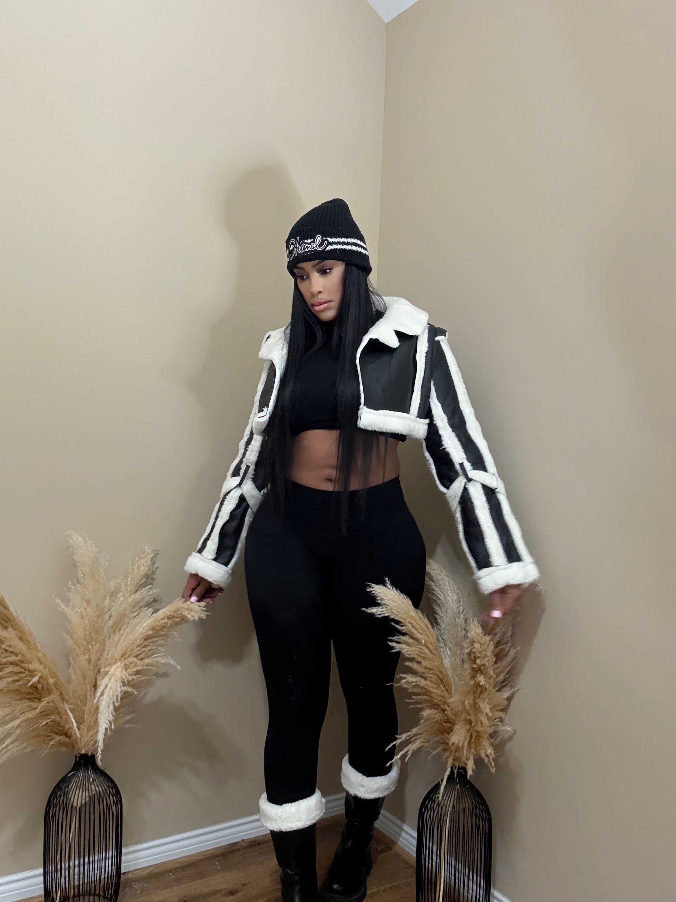 Cropped aviator-style fit Faux leather body shearling lining and trim Oversized lapel collar Belted sleeve and...